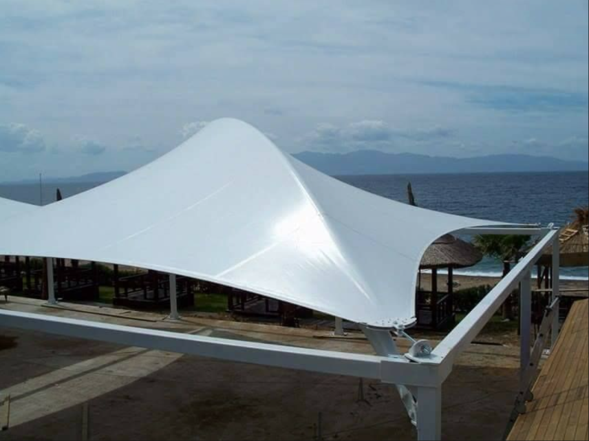 - Instalasi: Pemasangan rangka di lokasi, penarikan dan pengencangan kain membran, serta finishing.