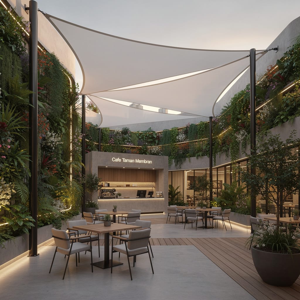 Penggabungan kanopi membran dengan taman vertikal menciptakan konsep eco-friendly yang sangat diminati.